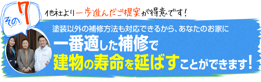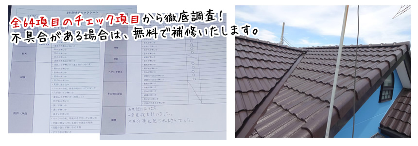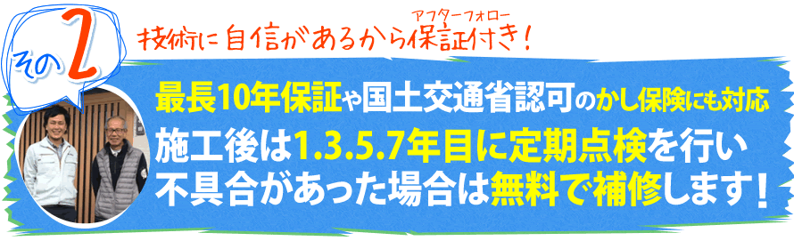 また、施工完了後から1.3.5.7年目には無料で定期点検を行い、不具合があった場合は、無料で補修いたします。