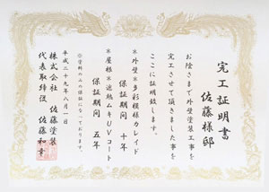 おかげさまで、大手塗料メーカーの日進産業さん(ガイナ)やTOTOさんから表彰していただいたり、市の入札業者に選ばれたり、国土交通大臣の許可をもらえるようになりました。