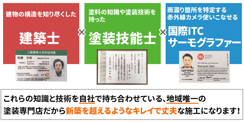 建物の劣化状況により、補修方法や塗るべき塗料は変わります。佐藤塗装では、建築士や塗装技能士、雨漏り調査の資格保有者が情報を持ち合わせ劣化状況と正しい補修プランを考えます。