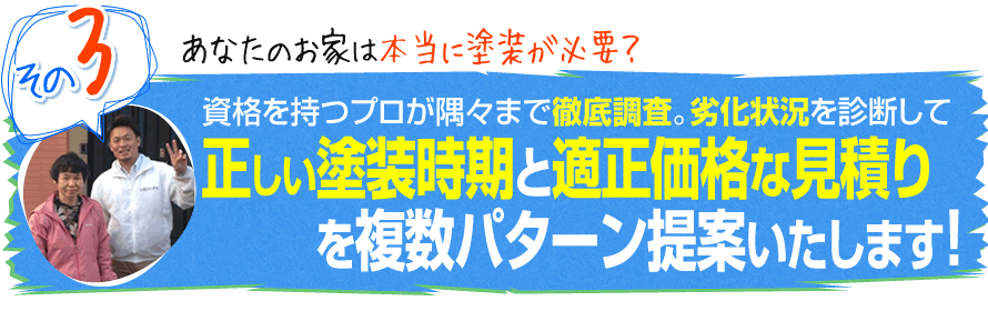 この調査を元に、あなたのお家に適した補修方法や塗料を考え、中間マージンなどの余計な費用がかからない適正価格の見積書を複数パターン提出します。