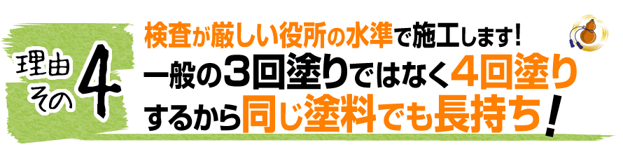 しかし、役所などの基準が厳しい建物だと、3回塗りでは基準を満たす塗膜の厚さにはならないケースもあります。そこで、もう1工程増やし4回塗りすることにより、役所の基準をクリアできます。